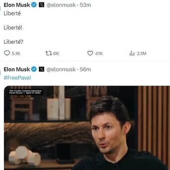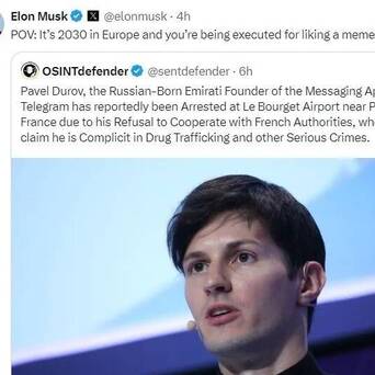 马斯克讽刺说——“拘捕杜罗夫是保护言论自由的美国宪法第一修正案的很有说服力的广告”。